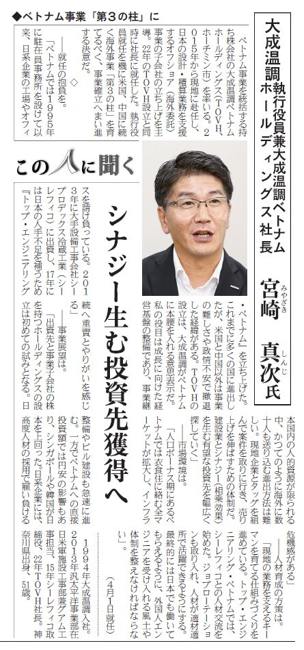 日刊建設工業新聞に、大成温調ベトナムホールディングス社長 宮崎のインタビュー記事が掲載されています。