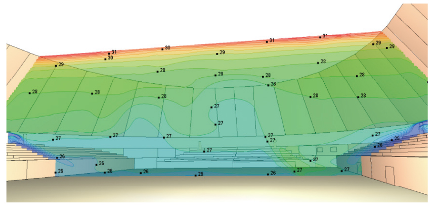 お客さまへのご提案に際し、熱流体シミュレーションによる解析も実施しています。熱流体シミュレーションとは、空気の流れや熱の移動をコンピュータで計算し、3次元的に可視化する技術です。室内形状をコンピュータ上に再現し、さらに空調機の仕様や吹き出し口の温度、風量、室内熱負荷などを入力して計算を行い、計算結果は温度分布図や風速矢印図として3Dビジュアルで表現されます。アニメーション動画を作成して、空気の流れや時間経過による温度変化を見ることも可能です。アリーナやホールなど天井の高い大空間では、吹き出し口の位置を工夫し、人が活動する床付近の空間を効率的に空調することで、使用エネルギーを削減することができます。また、熱流体シミュレーションを用いることで、換気効率やCO2濃度、PMV 等の解析も可能であり、各環境に応じた最適な空調システムを実現しています。